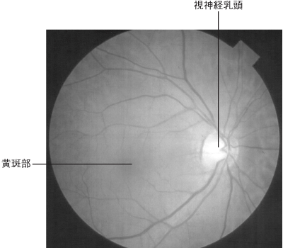 網膜の中央は視細胞が密集した最も感度の高い場所で、視野の中央に相当します。人が字を判読したりするのがこの部分で、黄斑といいます(図2)。視力は黄斑の機能を反映しています。