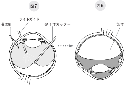 図7のように硝子体内に精巧な器具を挿入して(通常3か所から)、硝子体や網膜をひっぱっている膜状組織を除去します。続いて硝子体内に気体を注入して、剥がれた壁紙を壁に戻すように、剥離した網膜を気体で網膜色素上皮側におしつけます。