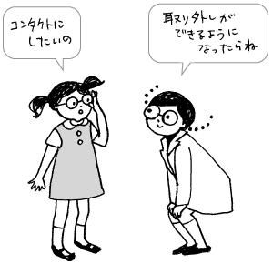 角膜の成長は5歳くらいで完成するといわれています。しかし、コンタクトレンズの装用は、自分で取り外しができるようになってからにすべきでしょう。装用中に見えにくい、痛みがある、涙っぽいなどの異常な症状があったときに、自分で取り外しができないと重篤な障害を起こすことがあるからです。角膜に障害があっても、ソフトコンタクトレンズではそれほど痛みを感じませんので、注意が必要です。