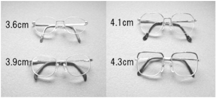 子どもは両目の間の距離が狭いので、成人用のメガネ枠ではレンズの中心がメガネ枠の中心からずれた所になってしまいます。そこで、子ども用のメガネ枠を使うようにしましょう。また、レンズと耳までの長さ(テンプル)も適切な枠を選ぶことが必要です。この長さが調整できるメガネ枠もあります。