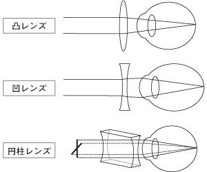 遠視の場合には網膜の後ろにあるピントを網膜面にもってくるために凸レンズで、近視では網膜の前にあるピントを凹レンズで矯正します。乱視は縦と横で屈折力の違う乱視用のレンズ(円柱レンズ)を用います。このほか、最近では屈折矯正手術やオルソケラトロジー(角膜矯正療法)なども用いられています。