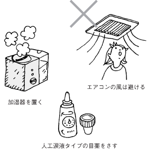 | Dr. | 作業中はときどき目をパチパチさせて、意識的にまばたきの回数を増やしてください。それから部屋が乾燥しすぎないように、加湿器をおきましょう。エアコンの風は目を乾燥させるので、直接当たらないようにしましょう。防腐剤の入っていない人工涙液タイプの目薬を1 日数回さすのも効果的です。 |