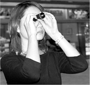 - 双眼鏡と同じ理屈で良い方の眼で見ます。手持ち式(図3)、眼鏡式(図1)