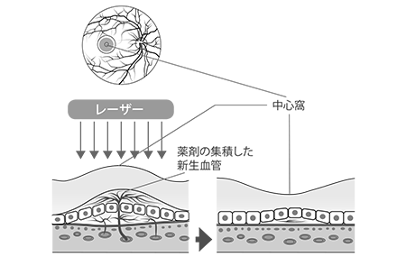 光に反応する薬剤(ベルテポルフィン)を体内に注射した後に、病変部に弱いレーザーを当てる治療で、初回治療の後、3ヵ月毎に病状を評価しながら治療を継続します。光感受性物質であるベルテポルフィンは、治療後しばらく体内にとどまりますので、肌に光があたるとやけどのような症状が出ることがあります。このため治療後5日間はなるべく外出を控え、直射日光が肌に触れないよう、帽子や手袋を着用する必要があります。 - 【レーザー光凝固術】