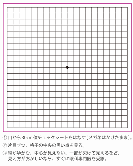 アムスラーチャートは縦横の格子状の直線が描かれているものです。老眼鏡をかけたまま30cmほど離れ、中心の黒い丸い点を片方の目のみで見ます。もし格子状の直線が波線になって見えたり、線が消えたり、ゆがんで見える部分があれば、黄斑前膜を含めた黄斑の病気である可能性が高くなります。早めに眼科を受診しましょう。