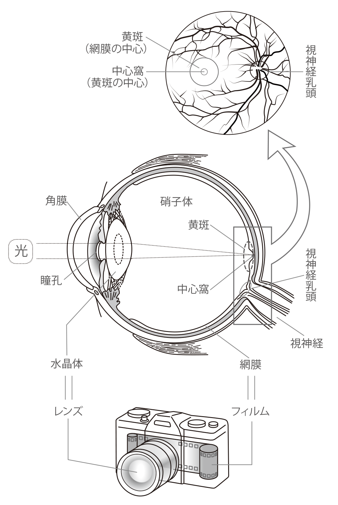 光が角膜(黒目)から眼球内に入り、瞳孔(瞳のまん中)、水晶体(白内障が起きる場所)、硝子体(目の中のゼリー)を通過し、網膜(光を感じる場所)の上に焦点が合うことで、人は物を見ることができます。その網膜の中心には黄斑(およそ直径2mm)があり、その黄斑の中心には中心窩(およそ直径0.3mm)という、浅い凹みがあります。