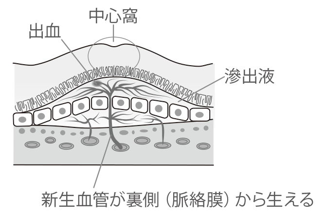 最近テレビなどでよく特集される加齢黄斑変性は、網膜の裏側から新しい弱い血管(新生血管)が生えて起きる別の病気です。加齢黄斑変性では、激しい出血が起きたり、黄斑が萎縮してしまうと失明することもあります。一方、黄斑前膜では新生血管が生えないため、出血や萎縮が起きることは少なく、基本的には失明には至らない比較的良性の病気といえます。しかし、見え方が悪くなることにより、生活に支障をきたすこともあります。