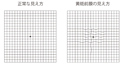 黄斑前膜の症状としては、ゆがみ(歪視)、大きく見える(大視症)、かすんで見える(霧視)などがあります。中高年の方は目の見え方には十分気を配り、少しでも症状があれば眼科受診をお勧めします。