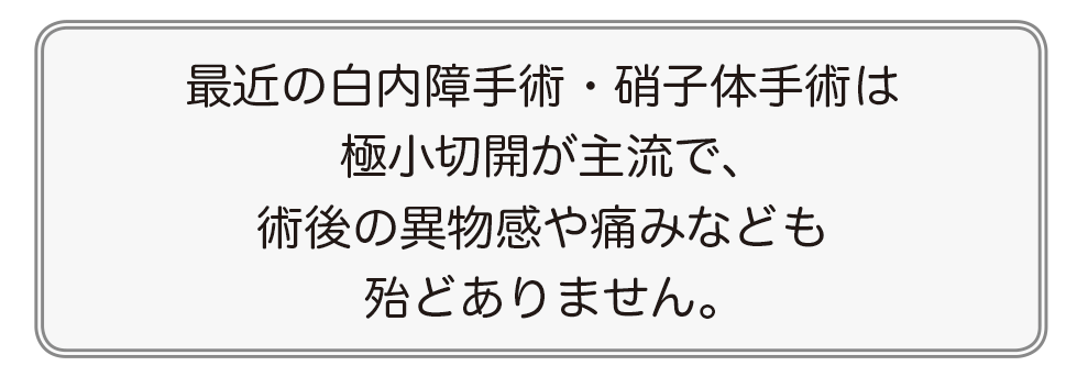 ●非常に稀ですが、手術合併症として、術中の大出血や術後の眼内炎で失明に至る可能性もゼロではありません。正しく理解して手術を受けましょう。抗血栓薬(血が固まりづらくなる薬)内服中や糖尿病など全身疾患のある患者さんは、より注意が必要になります。