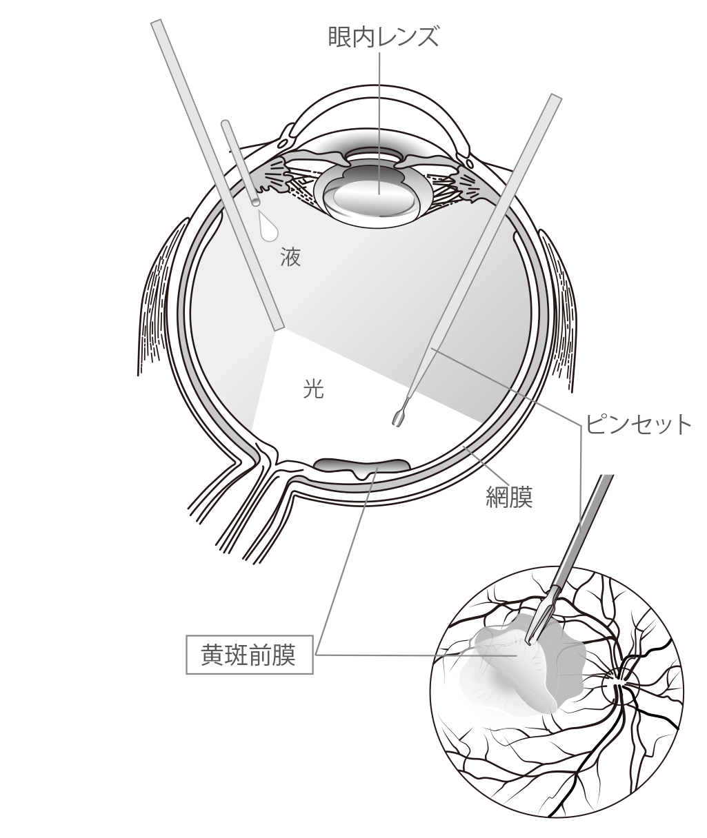 硝子体手術(しょうしたいしゅじゅつ)は、白目に1mm以内の穴を3 か所ほど開けて行い、硝子体を取り除いた後に、網膜の表面に張り付いている黄斑前膜をピンセットで丁寧に取り除きます。黄斑前膜の裏にある内境界膜も取り除くことが多く、その際は手術を行いやすくするため、ステロイド剤や染色剤を使います。網膜の周辺部に裂孔などがあれば、手術中にレーザー光凝固を行うこともあります。