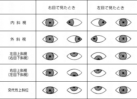 また、常に斜視になっているのを恒常性斜視、ときどき斜視になるのを間歇性斜視といいます。