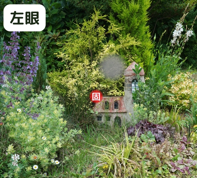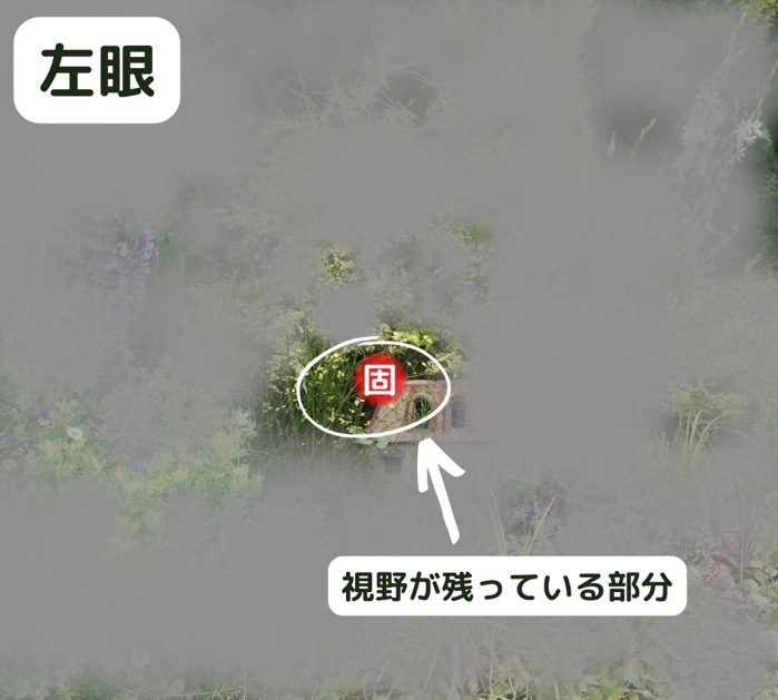 緑内障中期以降になると、徐々にかすみが強くなりますが、それでも緑内障ではないかと疑う方は、まだまだ多くはありません。以下の写真のように、片目(左眼の写真)の視野が極端に狭くなっていたとしても、もう片目(右眼の写真)の視野が保たれていれば、視野が狭いことに気づくことが遅くなります。